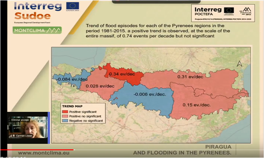 Carmen Llasat de la Universidad de Barcelona presentó los principales resultados del proyecto POCTEFA PIRAGUA que ha estudiado los episodios de inundaciones en los Pirineos. Carmen comentó en primer lugar que entre 1981 y 2015 se han producido 181 episodios de inundaciones en la cordillera pirenaica. Como consecuencia, ha habido un mínimo de 147 muertos y las indemnizaciones han ascendido a 100 M€. A continuación, Carmen explicó que los riesgos vienen determinados por la vulnerabilidad, la exposición y la peligrosidad. Destacó la distribución de la vulnerabilidad en los Pirineos, influida por la concentración de la mayor densidad de población en los Pirineos, principalmente en la vertiente norte. En este estudio, Carmen subrayó la discordancia entre las precipitaciones y la ocurrencia de inundaciones, que radica en el hecho de que muchos de los eventos extremos (inferiores a 24h) que producen episodios de inundaciones torrenciales son difíciles de captar por las estaciones de registro actuales. Carmen concluyó informando de una tendencia positiva observada en el número de episodios de inundaciones a escala de todo el Pirineo y en casi todas las regiones, pero sólo estadísticamente significativa en Nouvelle-Aquitaine. Los escenarios futuros apuntan a un aumento de las precipitaciones intensas y de la torrencialidad, y el valor expuesto está aumentando debido al importante incremento de población en primavera, verano y otoño, cuando las inundaciones son más frecuentes.