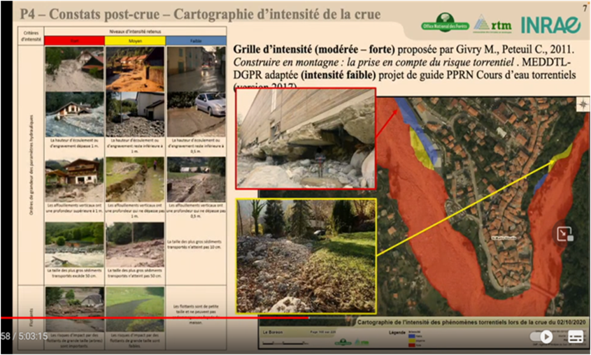 Simon Carladous, de la Office National Forets- Restauration des Terrains en Montagne (ONF-RTM), presentó el servicio del Estado francés STePRiM (estrategia territorial de la gestión de riesgos en montaña) para el diagnóstico multirriesgo en zonas de montaña. STePRiM se basa en un enfoque territorial y utiliza una metodología estructurada que va del diagnóstico a las decisiones de actuación. Simon insistió en la urgente necesidad de aplicar un enfoque específico a la gestión de riesgos en zonas de montaña, que ilustró con un ejemplo del caso del valle de Luchon. Señaló que estos riesgos en las zonas de montaña están relacionados con múltiples fenómenos naturales que pueden causar peligros a menudo superpuestos e interrelacionados y con nuestros limitados conocimientos y nuestra imperfecta cuantificación de los fenómenos. Simon prosiguió su presentación explicando las especificidades de las zonas de montaña En términos de activos socioeconómicos hay que tener en cuenta. Por ejemplo, la interrupción de las rutas de transporte y de las infraestructuras en las zonas de montaña debido a los fenómenos, tienen consecuencias críticas como la reducción del acceso y los impactos indirectos. Simon concluyó anunciando que se están elaborando 2 documentos nacionales para ayudar al Estado y a los municipios a aplicar el enfoque STePRIM.