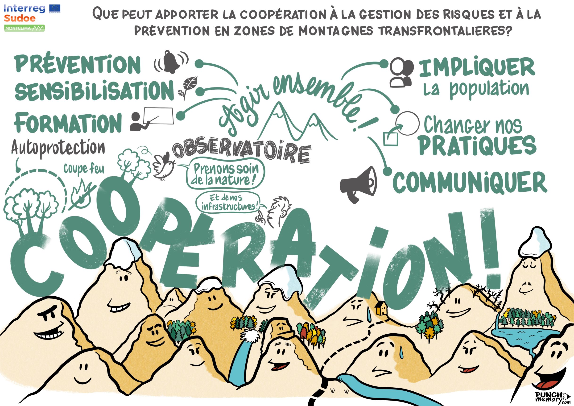 El seminario se dividió en 3 partes centradas en los principales objetivos estratégicos del proyecto, la capitalización de buenas prácticas exitosas, la prueba de estrategias a través de parcelas demostrativas y el marco estratégico para la gestión de riesgos naturales en las montañas del SUDOE. Por último, una mesa redonda reunió a 5 de los principales actores en torno al tema del papel de la cooperación en la gestión y prevención de riesgos en las zonas montañosas transfronterizas. Juan Terrádez concluyó el seminario resumiendo los mensajes clave del seminario, que se complementaron con unas sugerentes ilustraciones sobre las cuestiones clave del evento, diseñadas en tiempo real por el artista Guillaume Lefevre (Punch Memory).