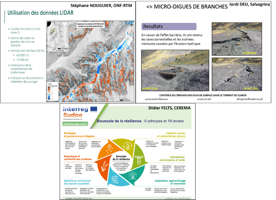 En el mismo contexto, Stéphane NOUGUIER, de la ONF-RTM, presentó el caso piloto MONTCLIMA sobre la evaluación de los fenómenos de erosion y dinámica de sedimetos en una cuenca de montaña mediterránea, tras la tormenta extrema Gloria, utilizando la tecnología LIDAR (Light Detection and Ranging). Mediante la comparación de los datos LIDAR antes y después de la tormenta, fue posible caracterizar y cuantificar (aunque con limitaciones) los fenómenos de erosión y deposición con una resolución considerable (límite de 20/30 cm). Stéphane concluyó afirmando que los fenómenos extremos, aunque menos frecuentes, tienen un impacto muy importante que debe tenerse en cuenta en las estrategias de resiliencia.